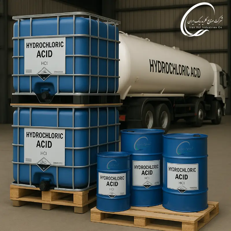 اسید کلریدریک یک ماده شیمیایی خطرناک است و بنابراین نحوه بسته بندی و حمل آن اهمیت بسیار زیادی دارد. روش های مختلفی برای بسته بندی این اسید وجود دارد که بر اساس حجم مورد نیاز و نوع کاربرد انتخاب می شوند. برای مقادیر کم، معمولاً از گالن های ۲۰ یا ۳۰ لیتری پلاستیکی استفاده می شود که حمل دستی نسبتا آسانی دارند. در حجم های متوسط صنعتی، بشکه های ۲۲۰ لیتری پلاستیکی یا فلزی متداول هستند که با استفاده از تجهیزات جابجایی مانند لیفتراک، انتقال می یابند. مخازن IBC با ظرفیت حدود ۱۰۰۰ لیتر گزینه دیگری برای حمل نیمه فله ای اسید هستند و در صادرات محدود یا تامین نیاز کارخانه ها استفاده می شوند. در صورت نیاز به حجم بسیار بالا، از تانکر های حمل فله (تانکر جاده ای یا کانتینر های مخصوص ایزوتانک) بهره گرفته می شود که توان حمل ده ها تن اسید را در یک نوبت دارند. هر یک از این روش ها مزایا و معایب خاص خود را دارند. در جدول زیر تفاوت ویژگی های هر روش بسته بندی به طور خلاصه مقایسه شده است: نکته مهم دیگر جنس مخازن است؛ اسید کلریدریک باید در ظروف مقاوم به خوردگی مانند پلاستیک مخصوص یا فلز پوشش دار نگهداری شود زیرا به فلزات عادی آسیب می رساند.